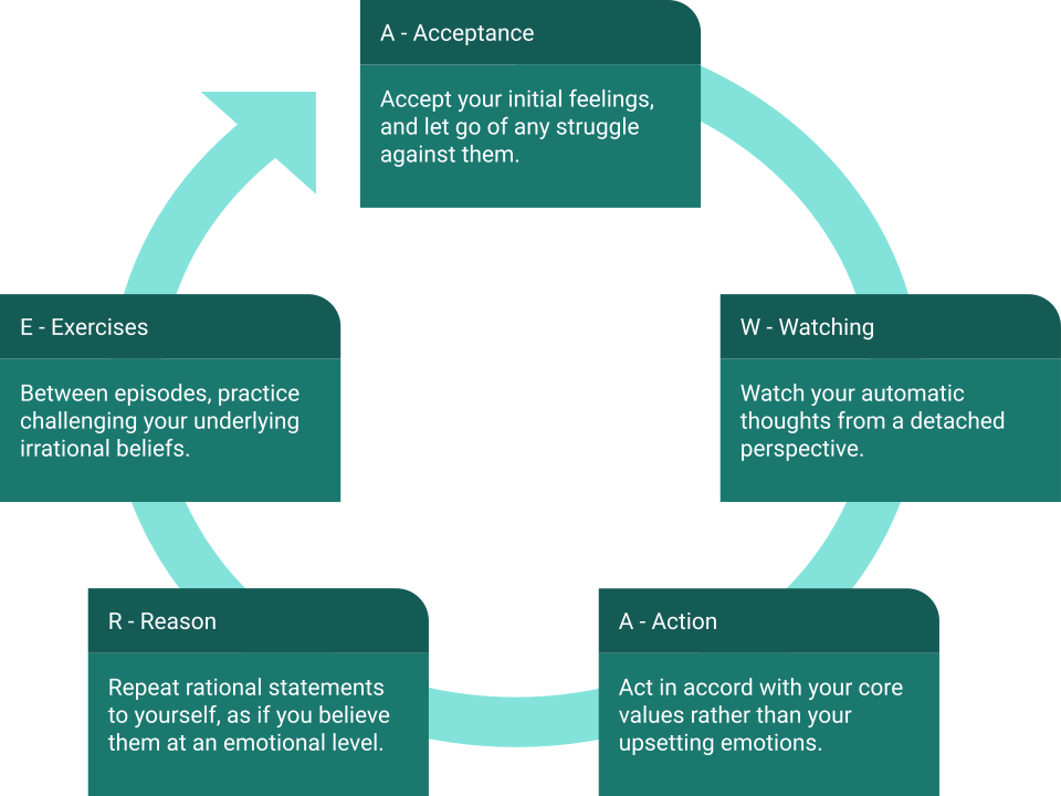 It’s a good idea to replace beliefs about unpleasant feelings being unbearable, which Ellis called “Low Frustration Tolerance” or “I-can’t-stand-it-itis”, with an attitude such as “I don’t like these feelings, but I can stand them.” That rational, flexible attitude toward will help you do the first A of AWARE by accepting your initial feelings. Certain ways of disputing the evidence for irrational beliefs can help you with the W of AWARE or watching thoughts in a detached manner, e.g., if asking “Where is this written in stone?” leads you to realize that your rigid rules, the SHOULDs and MUSTs, are subjective opinions not objective facts — they only exist in your head. Likewise, disputing beliefs about coping such as “I MUST seek reassurance whenever I feel upset" can help you with the second A and abandoning unhealthy emotion-driven behaviour.